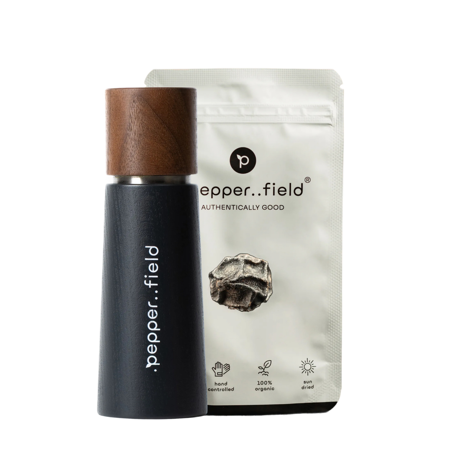 Tmavě šedý mlýnek .pepper..field original + černý Kampotský pepř (20 g)