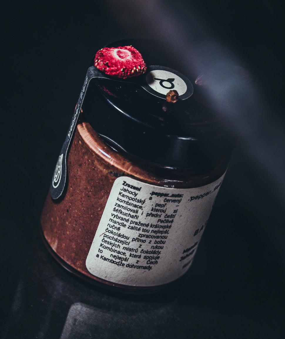Mandlové máslo s tmavou čokoládou, jahodami a Kampotským pepřem 150 g