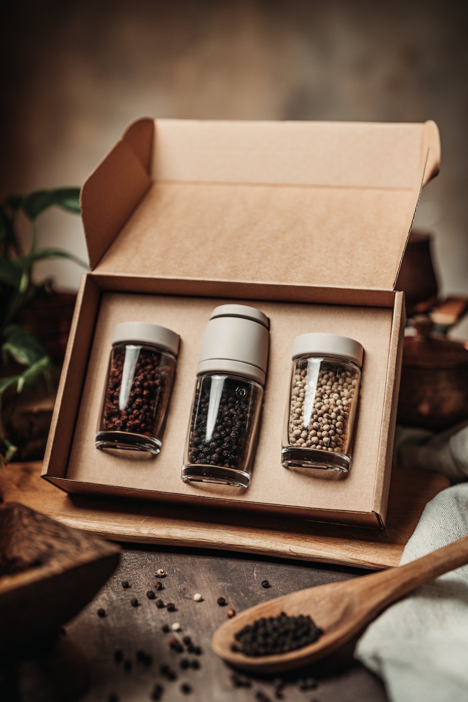 Vše, co jste od nás kdy potřebovali, jsme vložili do jediného ekonomického a ekologického setu, který umožňuje jednoduchým odšroubováním mlecího mechanismu střídat barvy pepře.