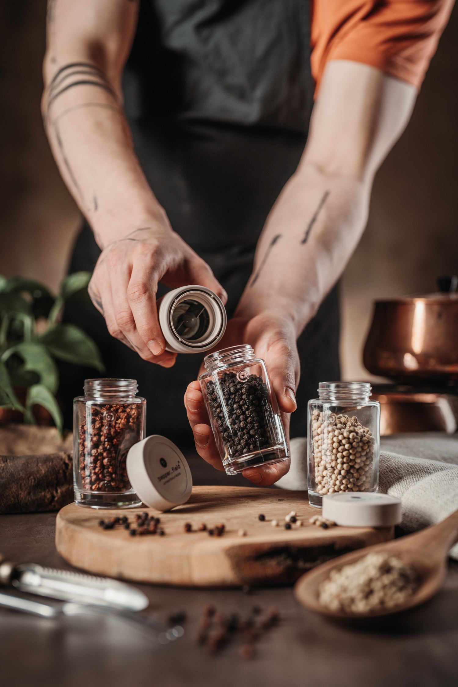 Pepř jsme pro maximální přehlednost uložili do skleněný zásobníků, a tak můžete během vaření mlít jeho různé barvy, bez jakéhokoliv omezení – rychle, přehledně a kdykoliv.