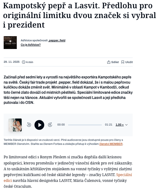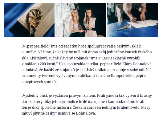Proto rádi spolupracujeme se slavnými českými návrháři a designéry. Protože stejně jako jsme hrdí na vzácnost každé kuličky Kampotského pepře z Kambodže, jsme hrdí i na slávu českého sklářství. Dvě krásné země spojené jedním úžasným .pepper..příběhem.