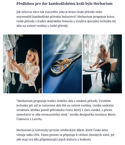 ...stojánkem na vonné tyčinky od Lasvitu. Jeho tvar navazuje na ikonickou instalaci Herbarium, ve které jsou české luční květy zasazeny do skla, vyzlaceny a tím je jim dán věčný život.