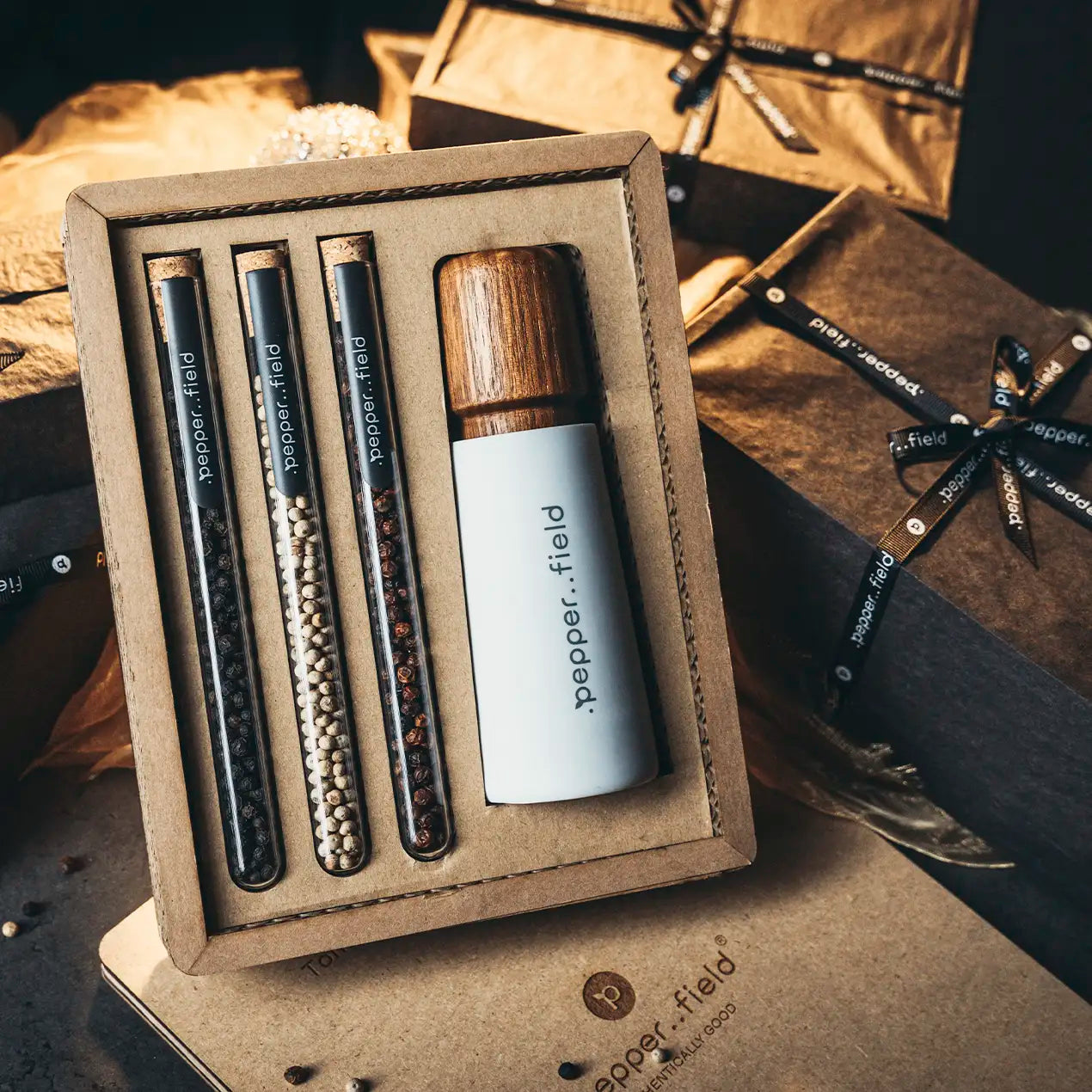 Každou sadu pečlivě kompletujeme ručně a zavazujeme stuhou. Detaily i tvar každé krabičky navrhujeme sami. Věříme, že nejlepší pepř světa si zaslouží to nejhezčí balení. Právě proto se naše dárky odlišují – precizností, elegancí a řemeslnou kvalitou, kterou jinde nenajdete.