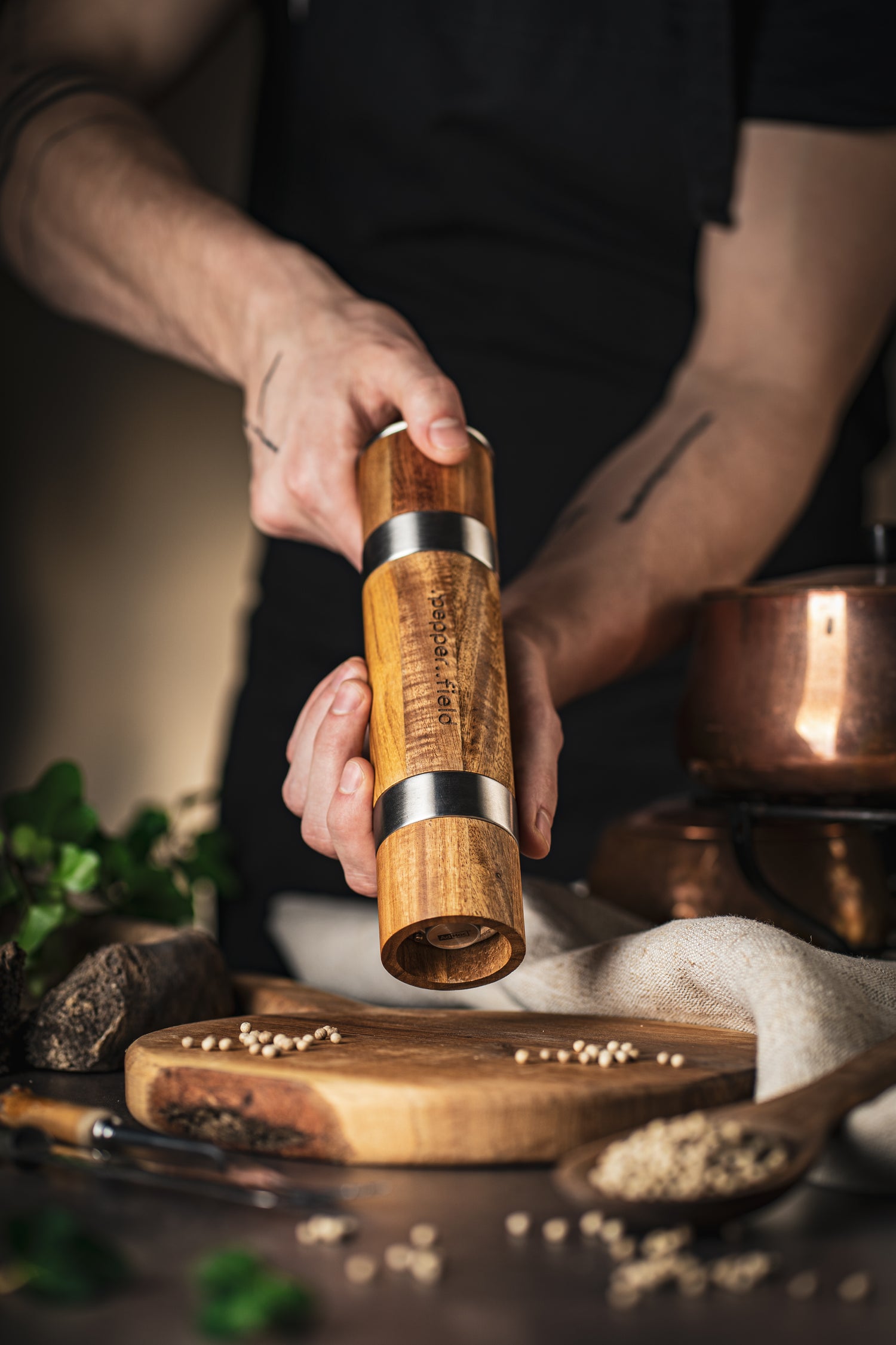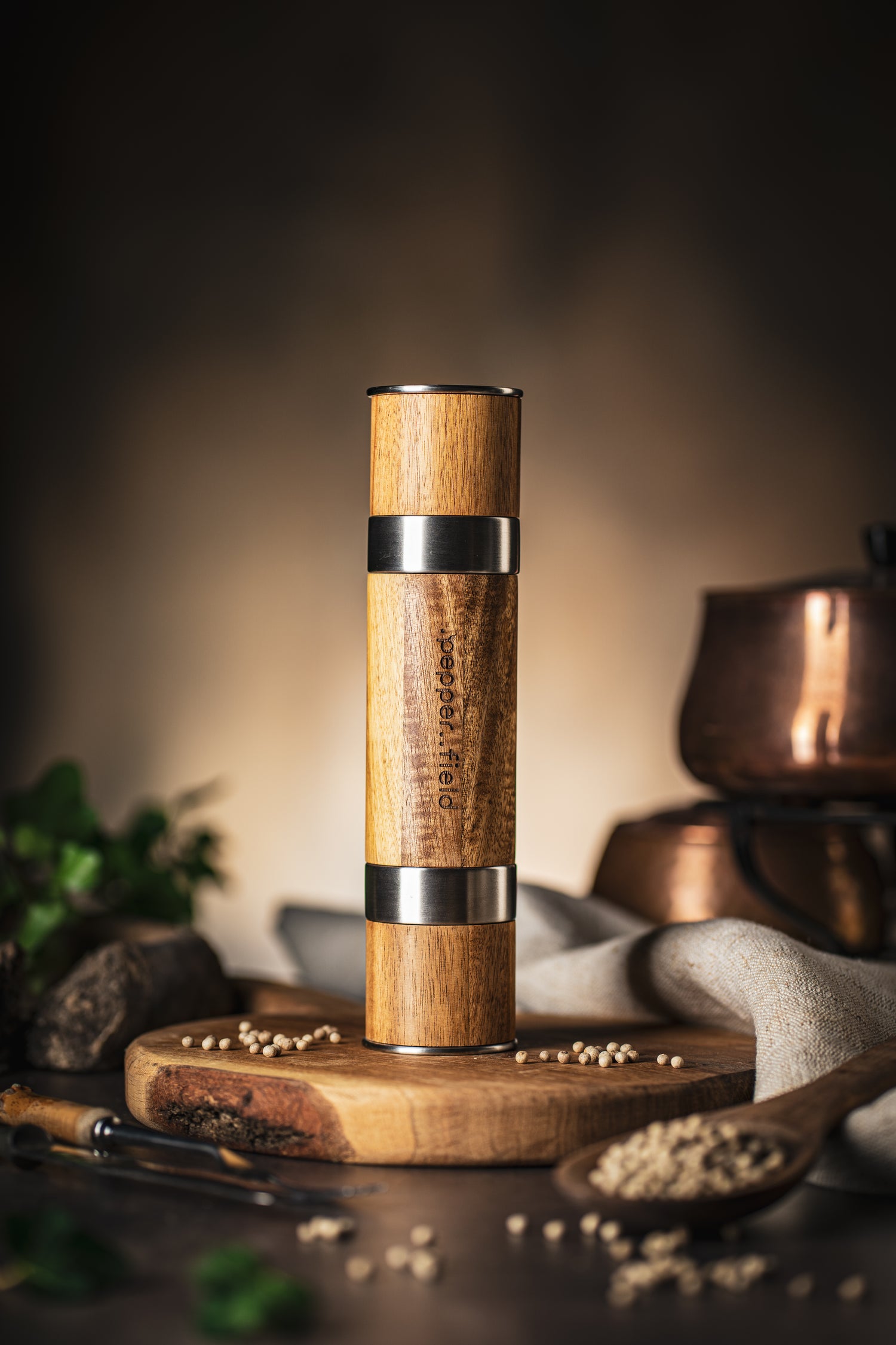 Pro výrobu tohoto mlýnku jsme použili akáciové dřevo s dokonalou kresbou, které se stane ozdobou každé kuchyňské linky či jídelního stolu.