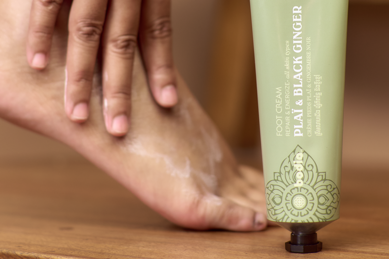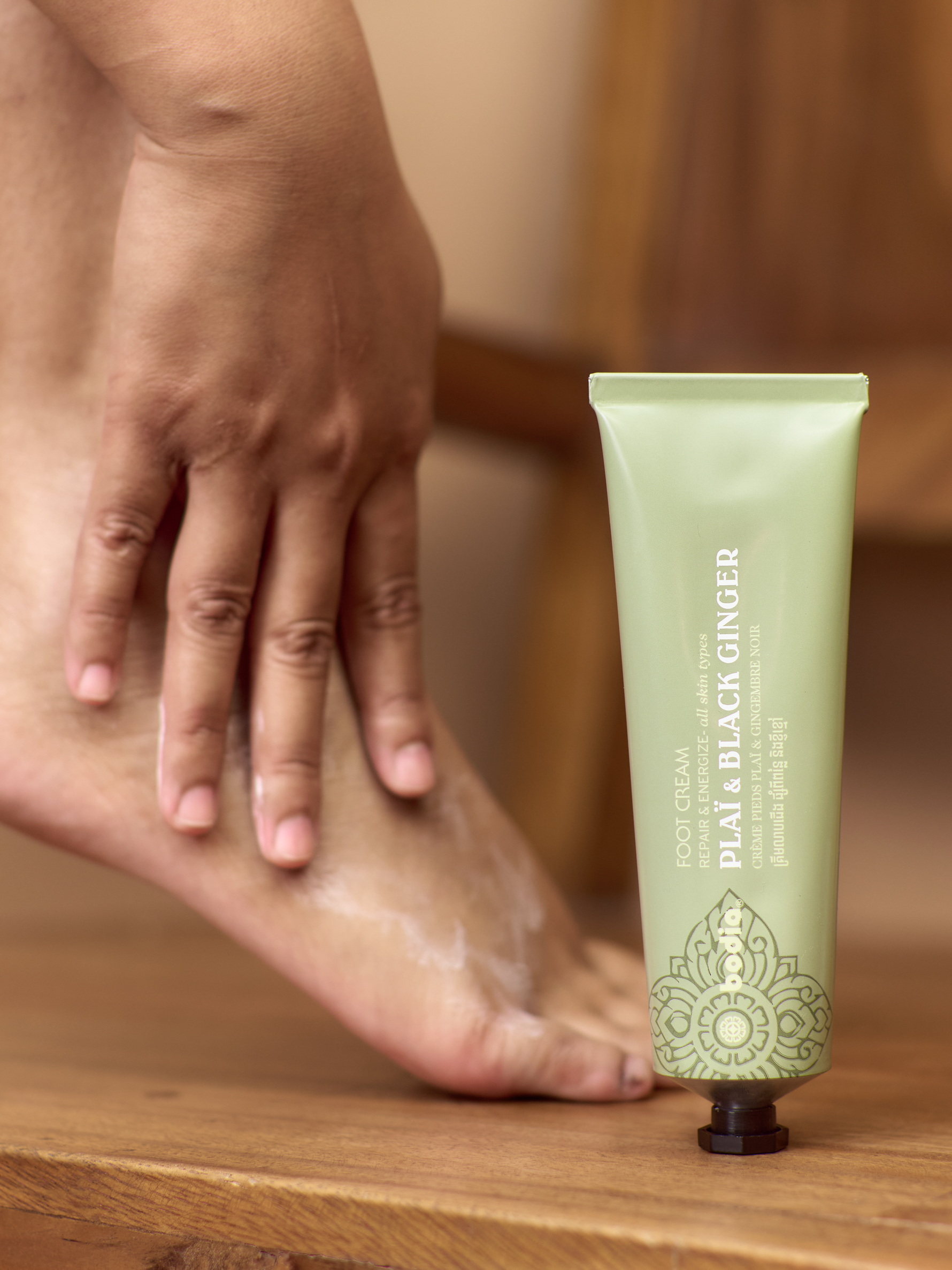 Extrakt z černého zázvoru: spolu s jemnou masáží nohou přispívá k lepšímu prokrvení nohou a k celkového osvěžení nohou po námaze. Extrakt z plai: pro osvěžení a revitalizaci nohou Bambucké máslo: pro hloubkovou regeneraci, výživu, hydrataci a dokonalou hedvábnou hladkost pokožky. Přispívá k lepší ochraně pokožky před negativními vlivy okolního prostředí. Rýžový olej: pro výživu, hydrataci a dokonalou jemnost pokožky. Mimořádně účinný anti-aging efekt. Glycerin: pro účinnou a dlouhodobou hydrataci.