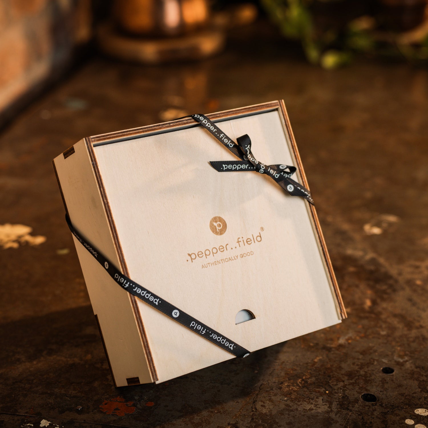 Simply, sustainably, and beautifully – that is our motto by which we strive to manage all our packaging. We have packed the jams into beautiful 100-gram glass jars, onto which our black ceramic pictograms have imparted a dash of flair and uniqueness. These were produced for us by the social therapy workshop Naděje Otrokovice, and 5 CZK from each sold jar goes directly to them! We stored the glass jars with jams in a wooden box from Polička together with a selection of our dried Kampot peppers 3x20g. All the packaging is easily recyclable and also suitable for upcycling.