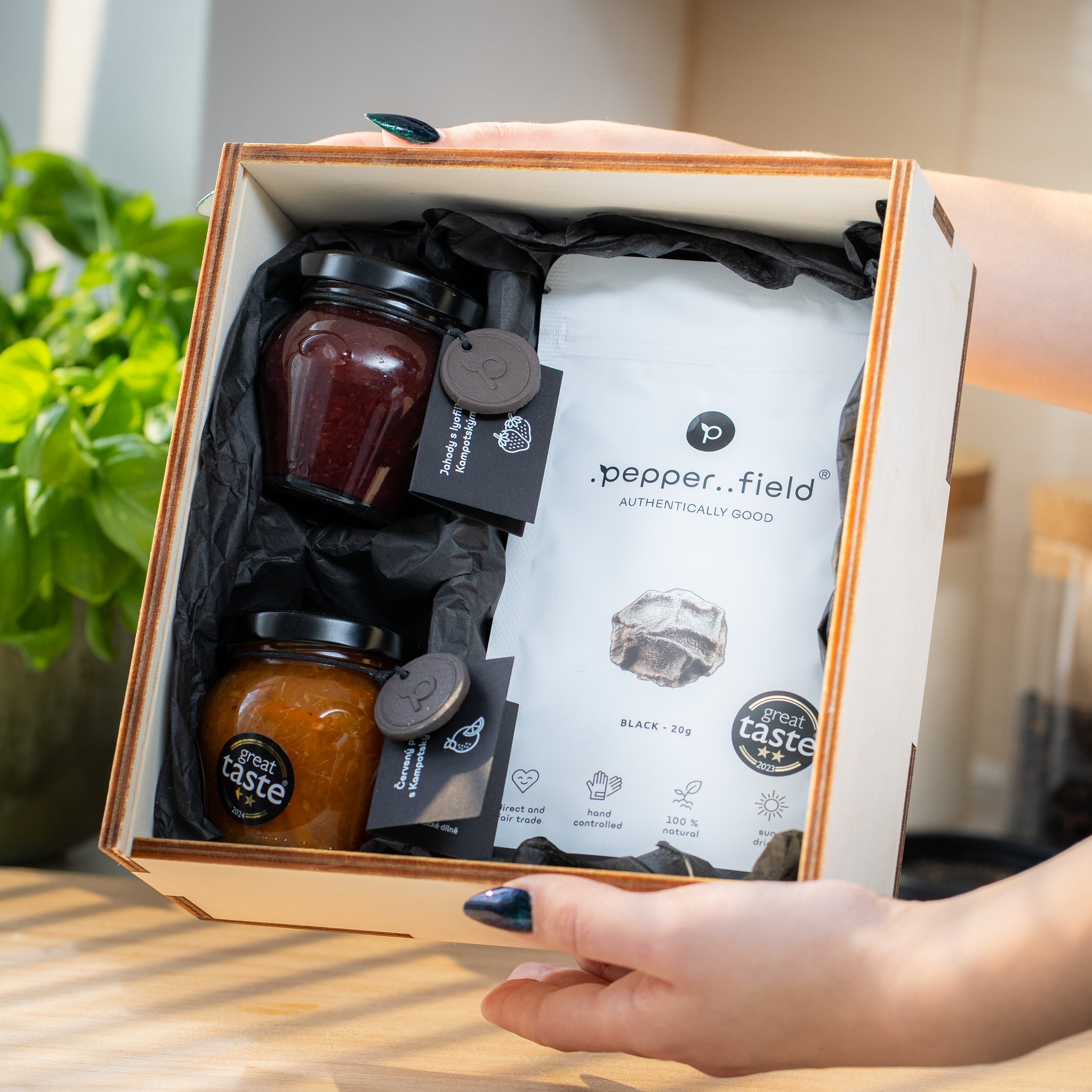 To je naše limitovaná edice 100 dárkových sad úspěšných marmelád se třemi druhy Kampotského pepře. Pochutnat si můžete na džemu ze šťavnatých červených pomerančů, který jsme spolu s MarmelLady spárovali s nezaměnitelnou chutí červeného Kampotského pepře! Nebo si můžete smlsnout na kombinaci sladkých jahod s lyofilizovaným Kampotským pepřem plným ovocných chutí.