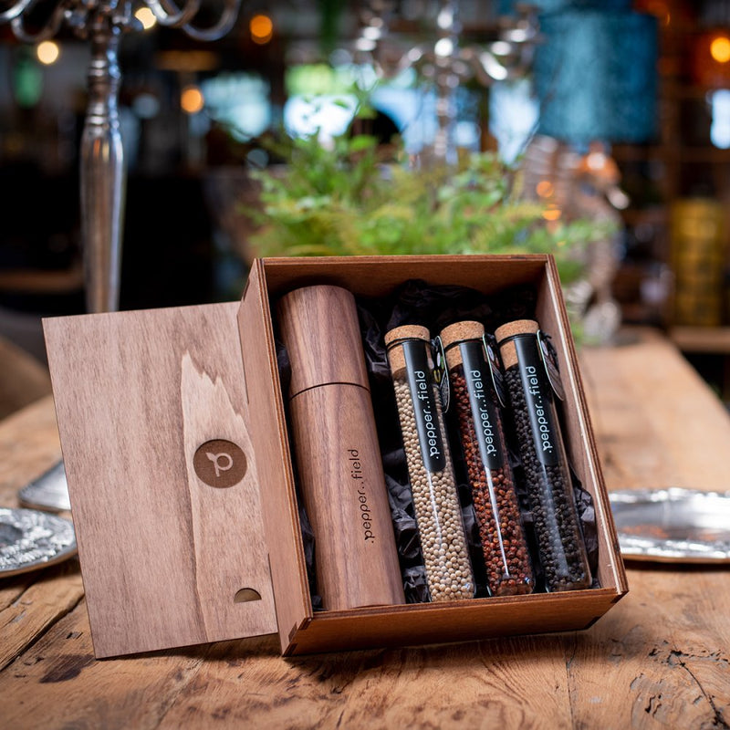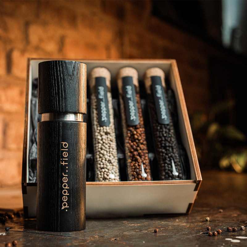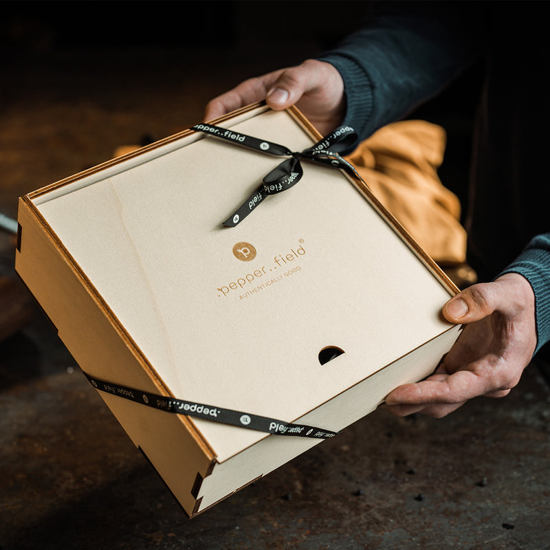 Ces emblématiques set cadeaux ont été à l'origine de notre histoire. Mais maintenant, une nouvelle ère de design arrive – et nous voulons leur donner de l'espace. Tous les set contiennent notre poivre de Kampot fraîchement récolté, soigneusement emballé et complété cette année. Seule la coque en bois ne sera plus produite.