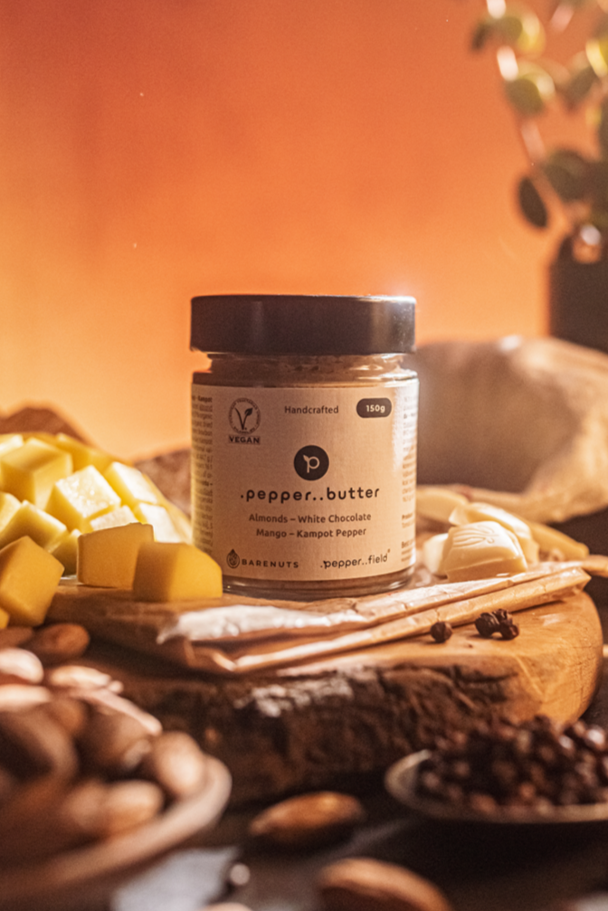 Cela vaut aussi pour notre beurre de cacahuète aromatisé aux cristaux de fleur de sel, au chocolat blanc et au poivre rouge de Kampot, que nous avons créé pour vous en collaboration avec la société Barenuts.