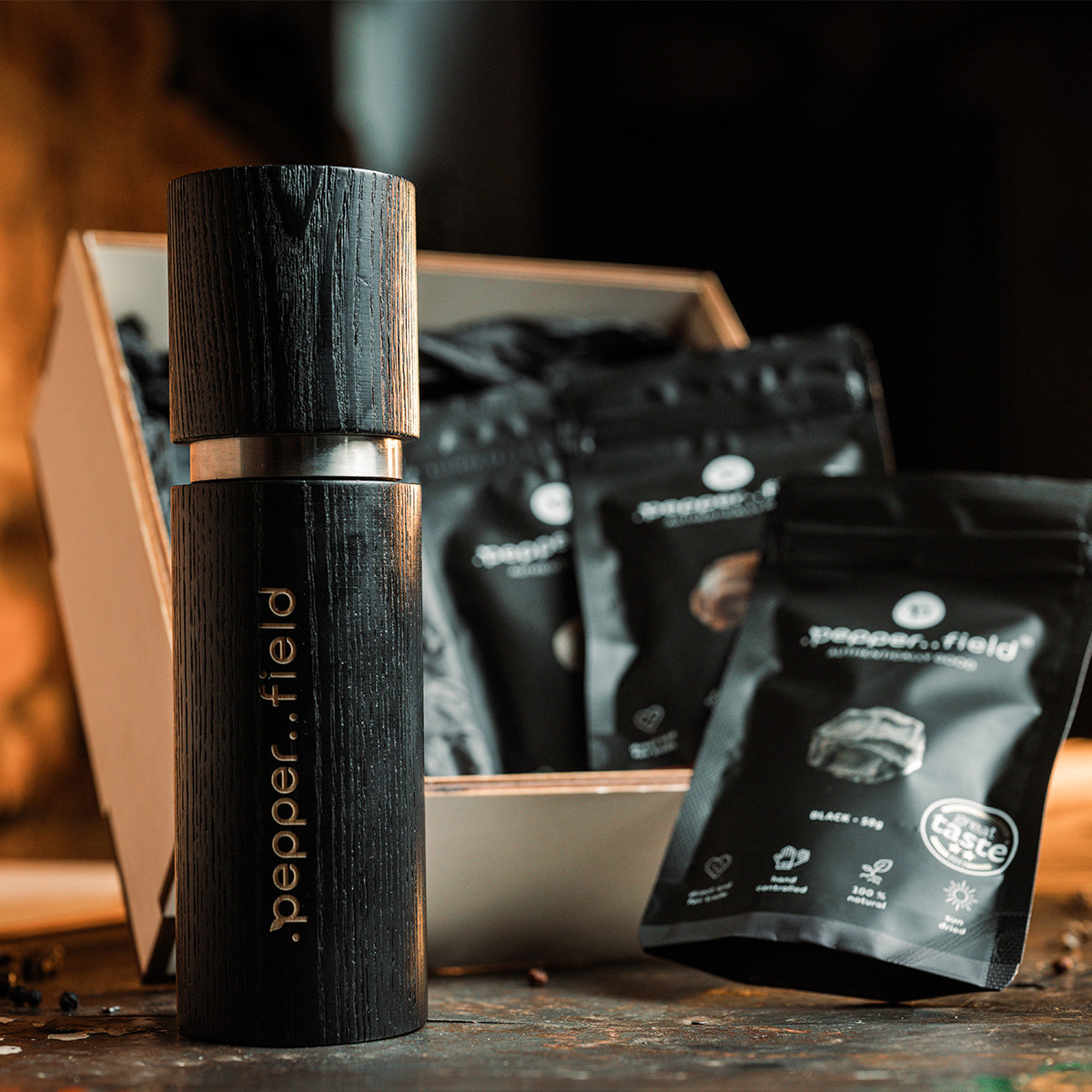 Ensemble de 3 moulins + 3 sachets de poivre de Kampot (3× 50 g) dans un énorme coffret cadeau