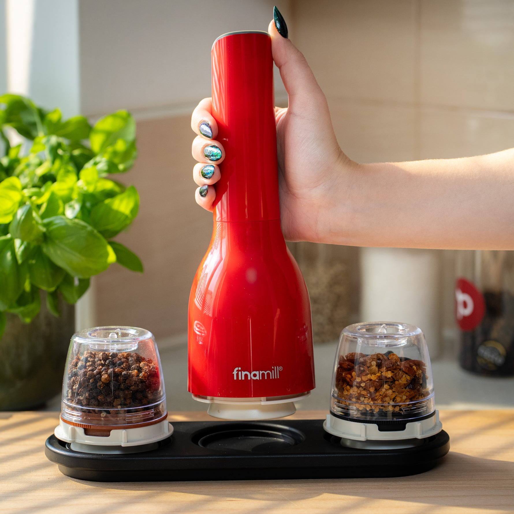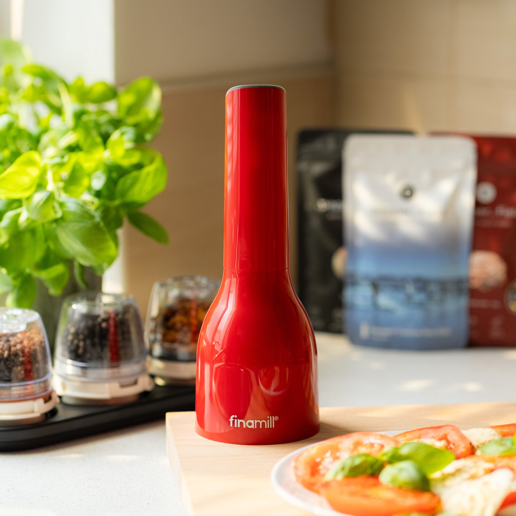 Darčeková sada FinaMill – lesklý červený batériový mlynček s dvoma zásobníkmi
