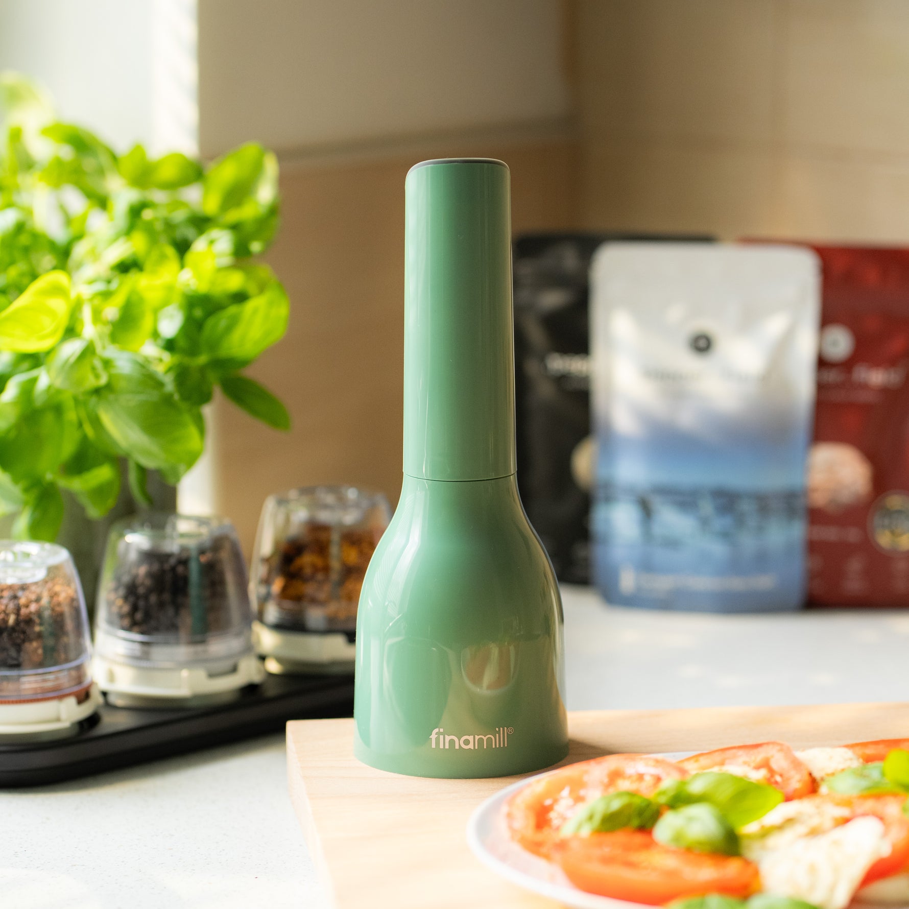 Darčeková sada FinaMill – lesklý zelený batériový mlynček s dvoma zásobníkmi